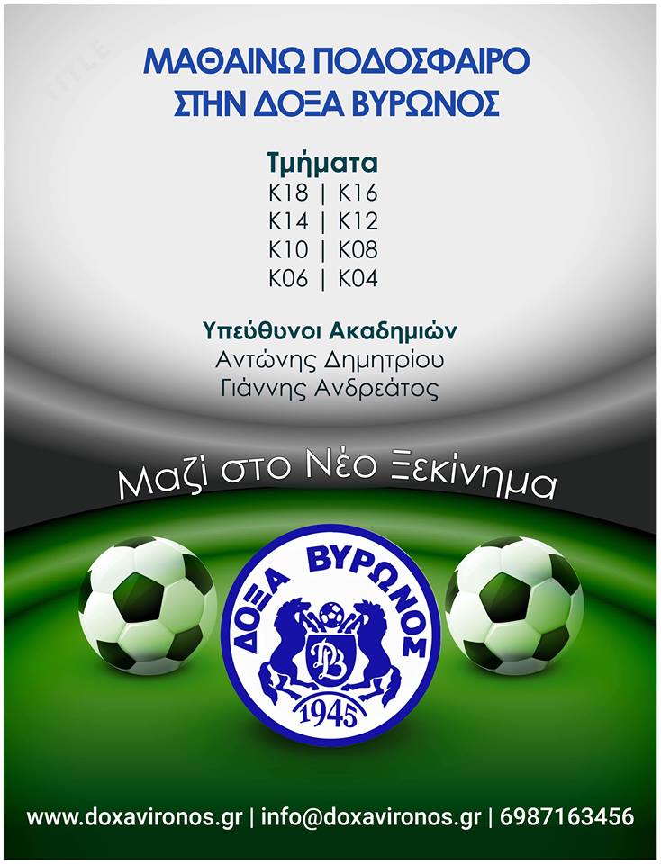 Εντάξου στην οικογένεια της Δόξας Βύρωνος, για να μάθεις τα μυστικά του ποδοσφαίρου κοντά στους καλύτερους προπονητές ακαδημιών. Για εμάς αποτελεί κεντρική φιλοσοφία το να αγαπήσεις τον αθλητισμό, το ποδόσφαιρο και να διασκεδάσεις μέσα από αυτό. Οι υπεύθυνοι των ακαδημιών μας, κύριοι Αντώνης Δημητρίου και Γιάννης Ανδρεάτος, με πολυετή εμπειρία στην προπόνηση παιδιών και νεαρών ποδοσφαιριστών θα δώσουν έμφαση στις ανάγκες και στις δυνατότητες της κάθε ηλικίας. Μάθε ποδόσφαιρο κοντά μας. Αγάπησε τον αθλητισμό στη Δόξα Βύρωνος. Μαζί, στο νέο ξεκίνημα.