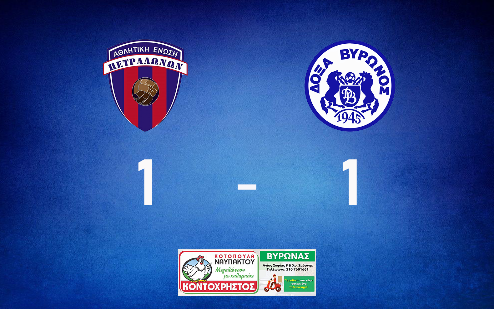 Το ημίχρονο έκλεισε με την μοναδική απειλητική στιγμή της Δόξα Βύρωνος στα πρώτα 45′, όταν ο Κίλιας με έξυπνη εκτέλεση φάουλ πέρασε την μπάλα κάτω από το τείχος των Πετραλώνων αναγκάζοντας τον Τσαρτσιταλίδη να στείλει την μπάλα κόρνερ με δυσκολία.